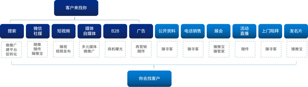 在珍岛T云平台上,有10多个获客渠道,总体上可以分为2种形式,一种是让客户来找你;另一种是你去找客户。