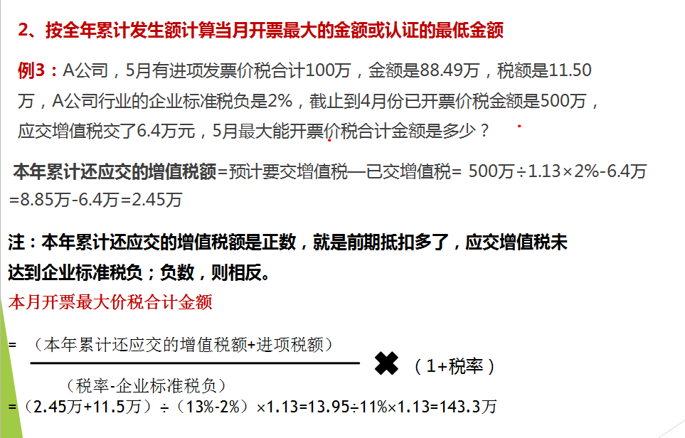 2、按全年累计发生额计算当月开票最大的金额或认证的最低金额: