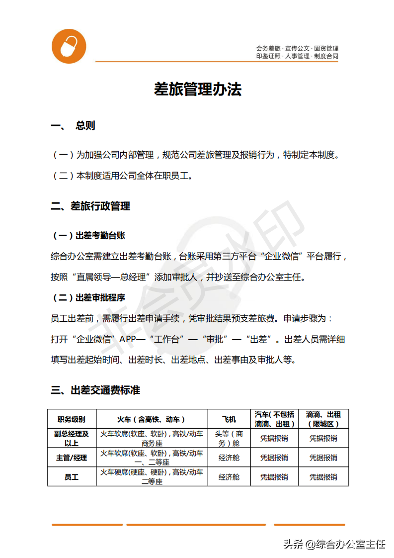 今日分享的《企业差旅管理办法》,对以上两点内容做了详细的解释说明:
