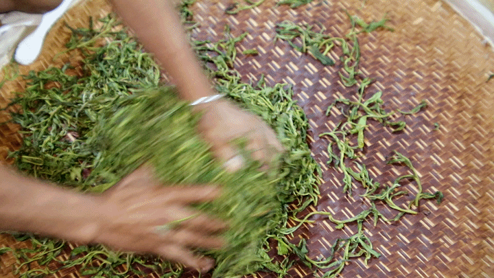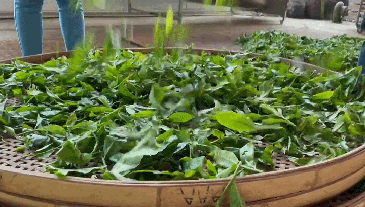 随着时间的推移,在自然风的作用下,鲜叶会逐渐散去热度,内含的水分逐渐蒸发,叶子的青草气也被挥发掉。原本新鲜的芽叶因此变得柔软,在后续的杀青和揉捻时才不容易破损。