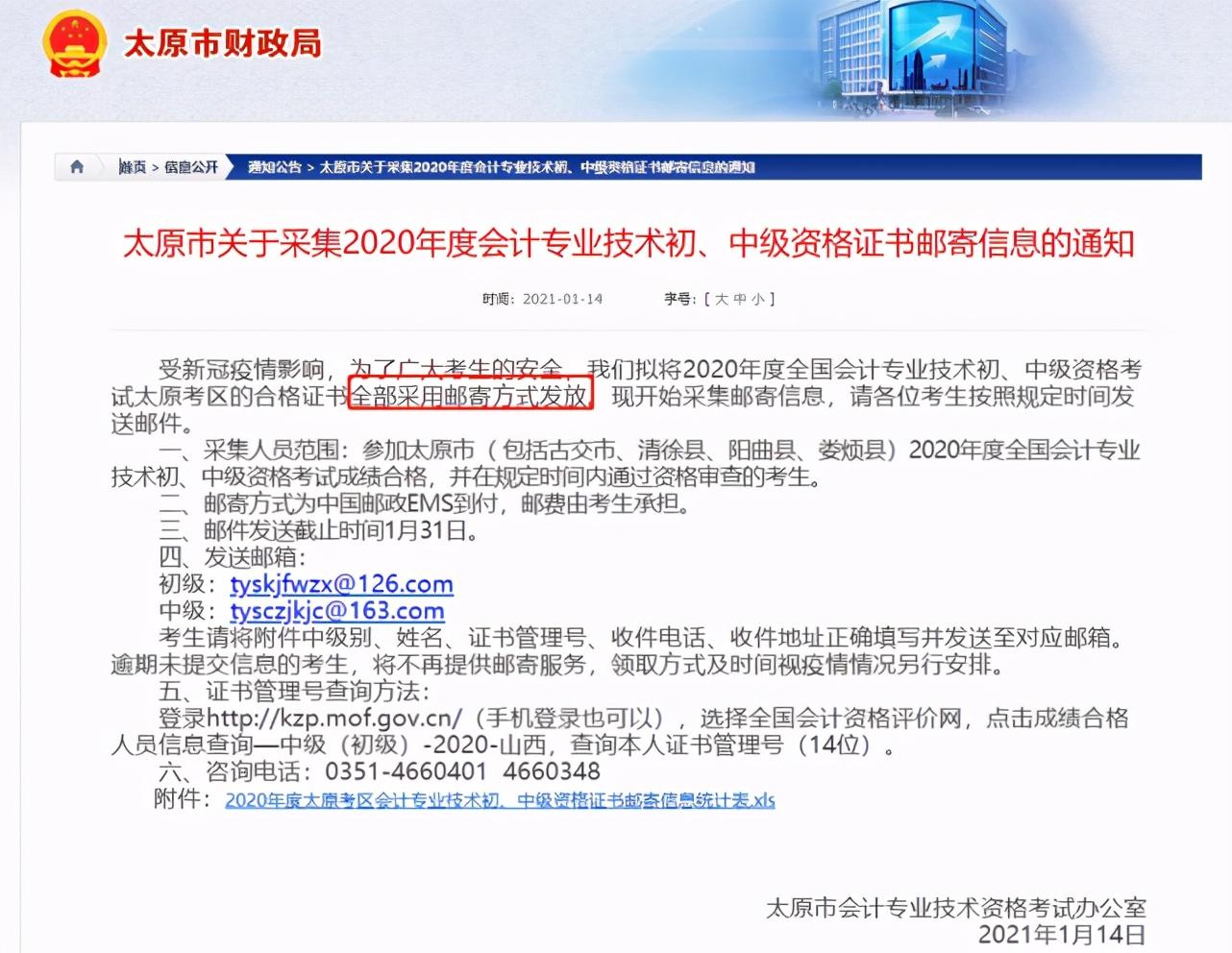 受新冠疫情影响,为了广大考生的安全,我们拟将2020年度全国会计专业技术初、中级资格考试太原考区的合格证书全部采用邮寄方式发放。现开始采集邮寄信息,请各位考生按照规定时间发送邮件。