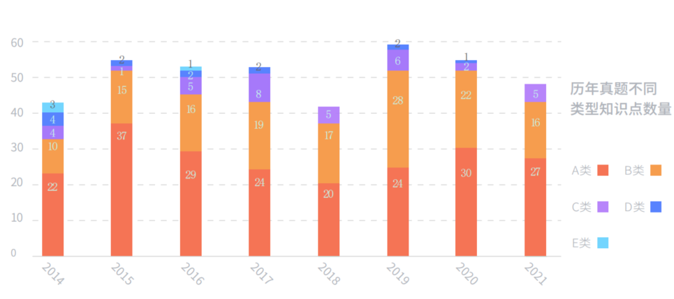 分析不同类型知识点考察数量可知,司法部每年命题还是很固定的,AB类知识点基本每年都固定占70-80%,DE类知识点几乎不考,不会出现哪一年全考偏的情况,并且我们对考点的分类和标签是正确的,基本和司法部一致,在往年试卷中形成规律性分布。