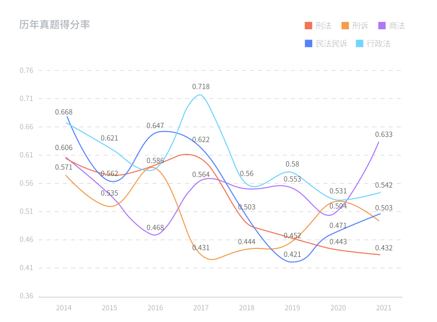 那么哪一年法考最难?经过我们的分析,会存在某个科目某一年的题明显偏难的情况,但不会当年所有科目都难,一个科目难,其他科目就会偏简单,整体综合难度系数是稳定的。