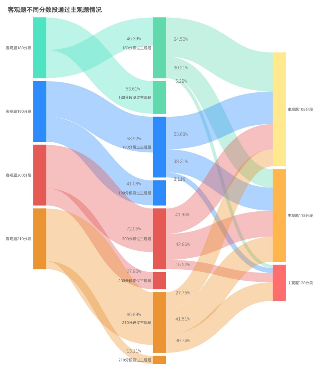 由上图可知,客观题分数和主观题通过率有非常直接的关系,如果你客观题在210分以上,当年考主观题的通过率就有87%左右。如果你只是刚好过线,考180-190分的,你当年主观题通过率就只有46%,而且即使考过了,也是擦线过,稍微运气差一些就废了。