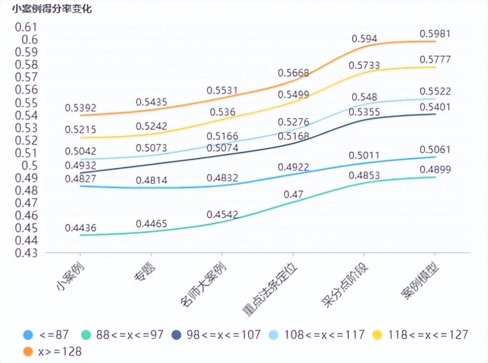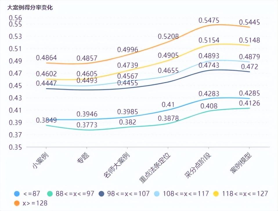 得分率指标:这轮主要是提高大案例的,因此小案例维持之前的水平就差不多,得分率达到57%以上就很好了,不要低于54%。但大案例得分率要上去一些,达到52%以上为合格,达到54%以上是优秀了。