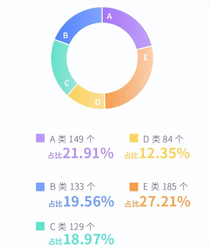 从各科目整体分布统计看来,A类知识点共有149个,占比21.91%,B类知识点共有133个,占比19.56%,C类知识点共有129个,占比18.97%,D类知识点共有84个,占比12.35%,E类知识点共有185个,占比27.21%。