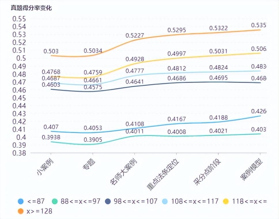 得分率指标:法条阶段+采分点阶段是可以明显提升得分率的,因此,本阶段之后,小案例得分率在54%以上才算合格,57%以上就是优秀。综合大案例难度较高,得分率在48%以上就算合格,50%以上优秀了。