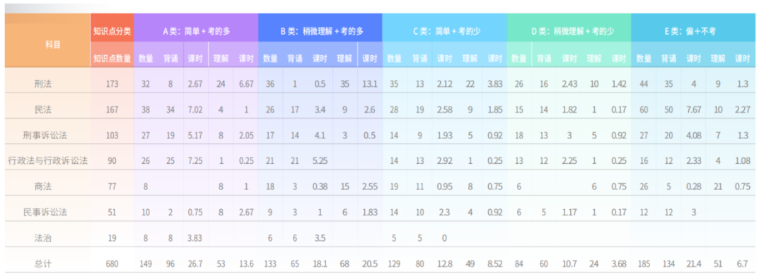 法考主观题相较于客观题来说只考察7个科目,包括刑法、刑诉、民法、民诉、行政法、商法以及法治思想,觉晓教学部门把各个科目按章节和知识点进行划分,共计680个知识点,从历年考频和难度将所有知识点打标签,最后分为A类(简单+考的多)、B类(稍微理解+考得多)、C类(简单+考的少)、D类(稍微理解+考的少)、E类(偏+不考)共5个类别;又从知识点特性出发,将知识点分为背诵类和理解类;并根据往年授课视频时长,为每个知识点标注了课程时长。