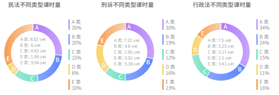 备注:课时是指讲解知识点课程的视频时长,不含法条、案例等课程,时长是根据往年觉晓内部班课程计算,觉晓的课程主要针对在职考生,因此在行业内中会偏精简,其他机构课程,课时会多1.5—3倍。