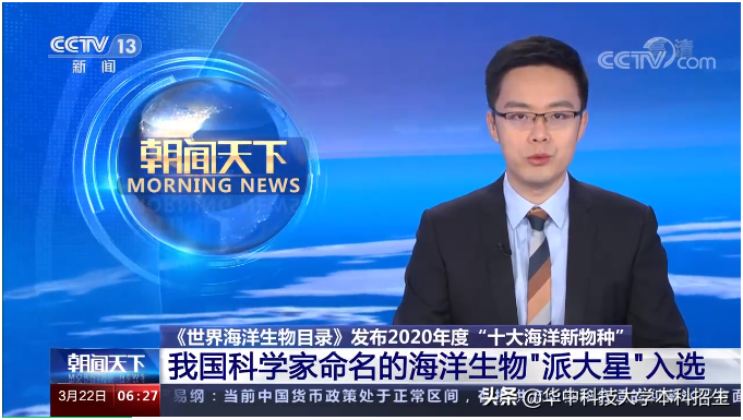 2021年4月,全球权威海洋生物学数据库《世界海洋生物目录》(World Register of Marine Species,WoRMS)发布了2020年度“十大海洋新物种”名单。华中科技大学2016届外国语学院毕业生、启明学院生命科学与技术创新基地iGEM团队成员张睿妍为新物种命名“派大星”,入选了2020年度“十大海洋新物种”名单,这是首次由我国大陆科学家命名并发表的海洋生物物种入选该名单。央视《朝闻天下》对此进行了报道。