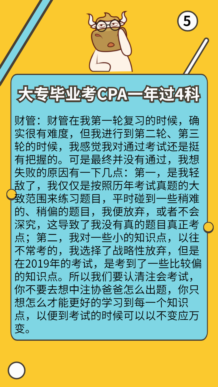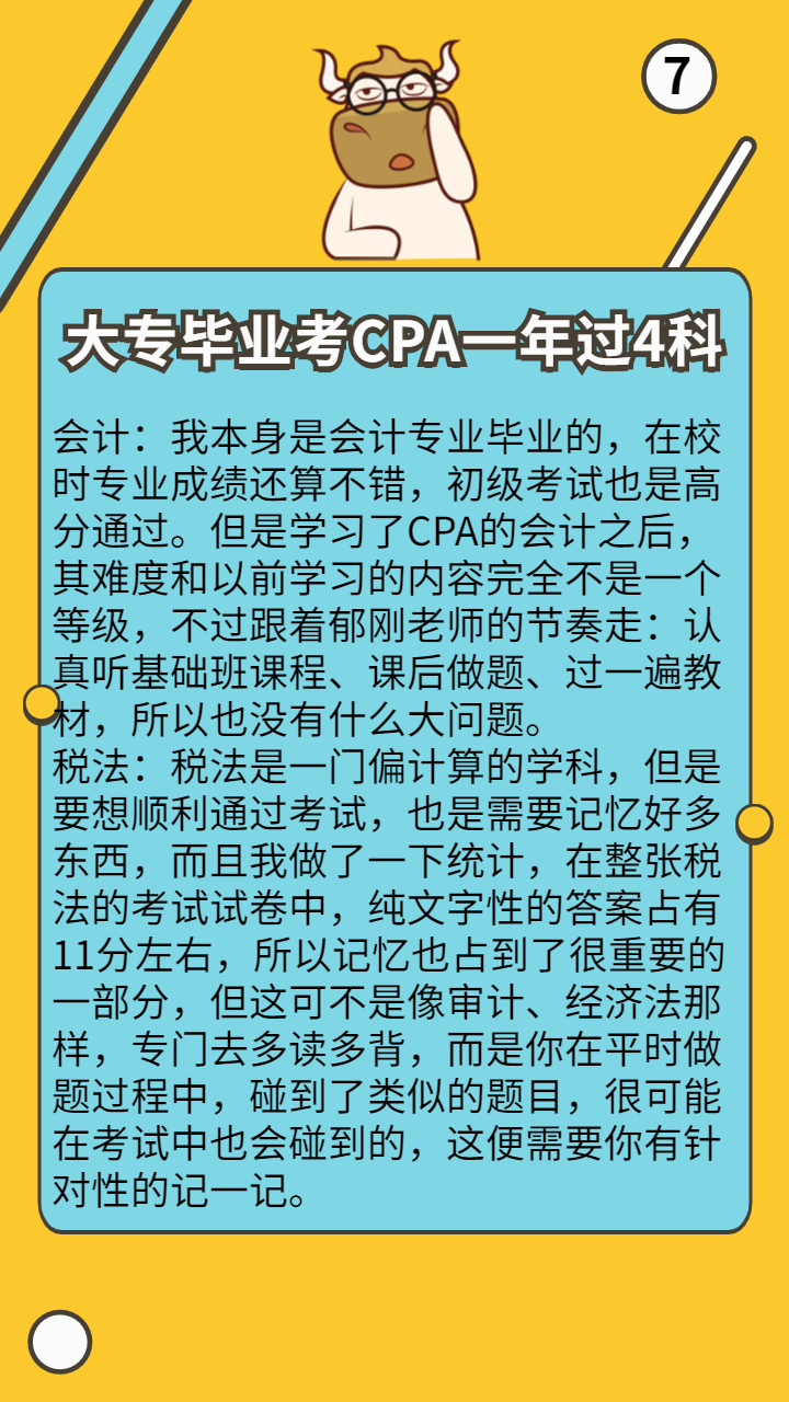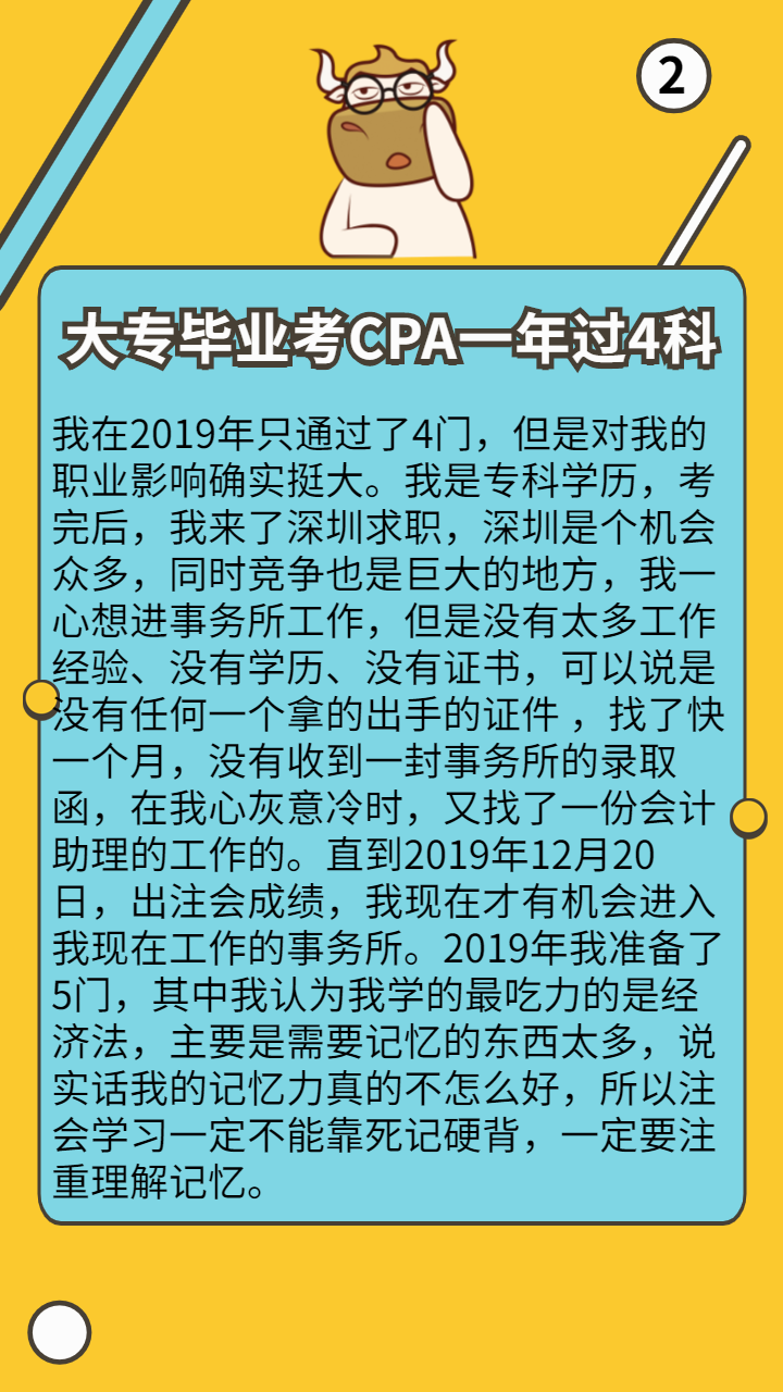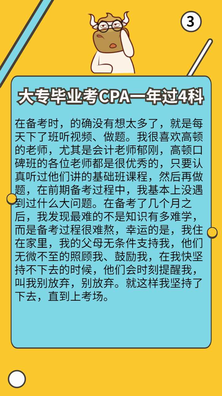 高顿CPA每年也有不少学员是大专生,通过自己勤奋学习,通过注册会计师考试,我们挑选一位考生经验: