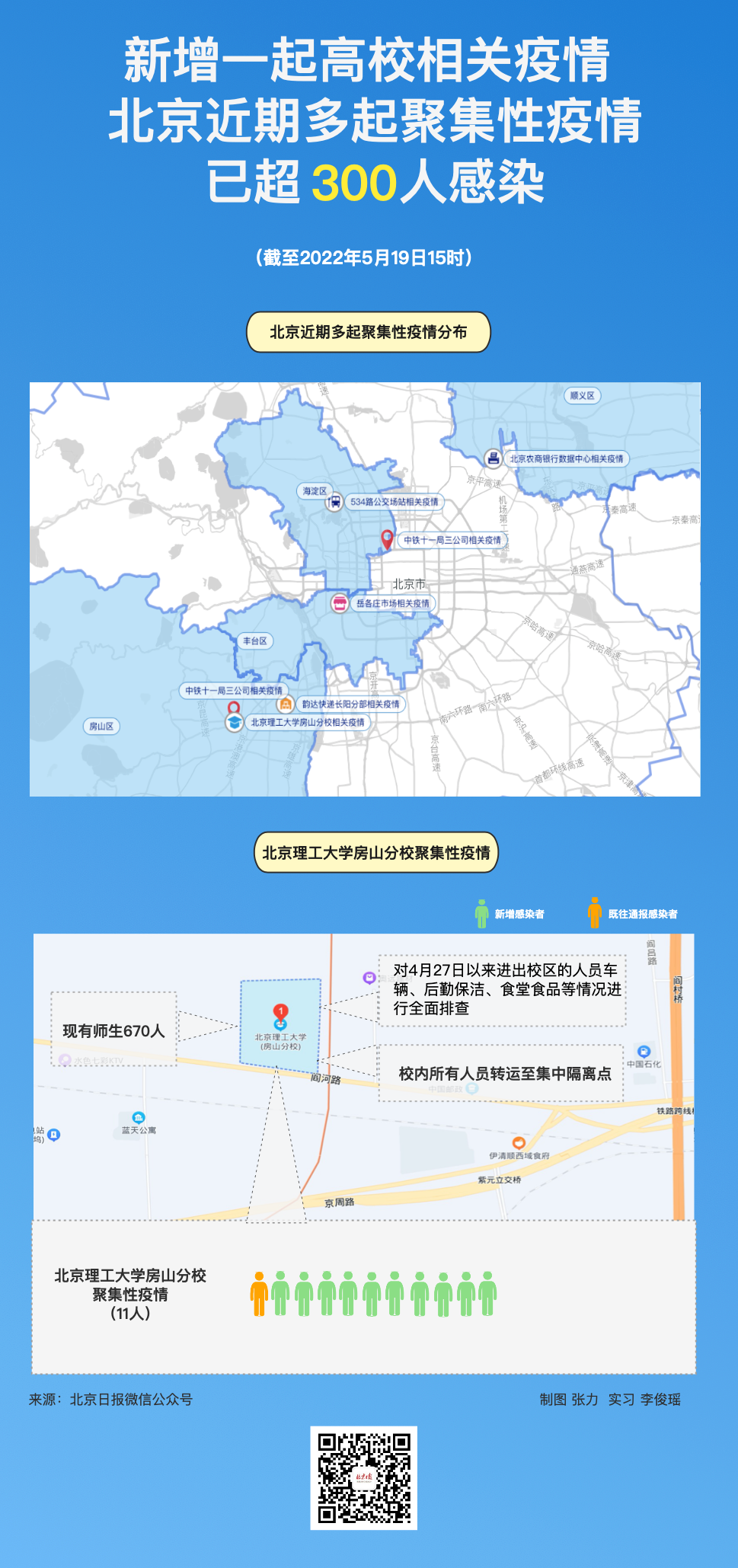 5月19日发布会上,北京通报新增一起高校聚集性疫情——北京理工大学房山分校已累计11人确诊。