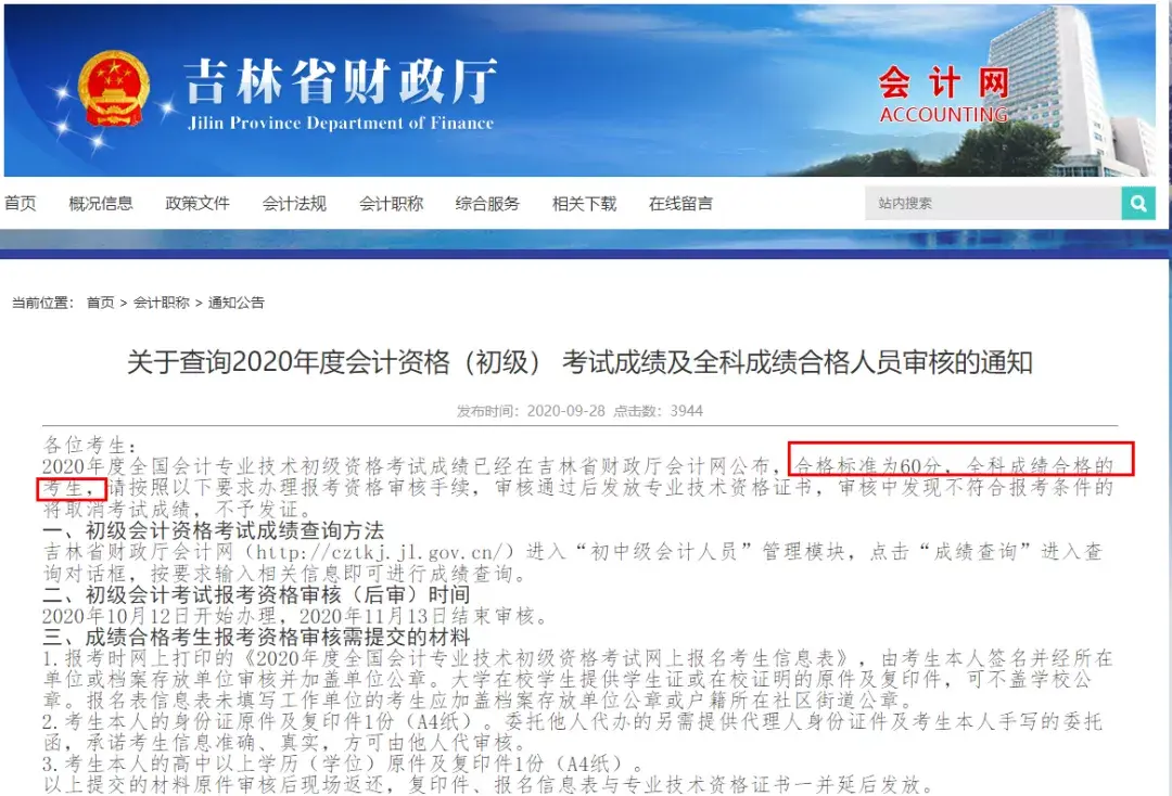 2020年度全国会计专业技术初级资格考试成绩已经在吉林省财政厅会计网公布,合格标准为60分,全科成绩合格的考生,请按照以下要求办理报考资格审核手续,审核通过后发放专业技术资格证书,审核中发现不符合报考条件的将取消考试成绩,不予发证。