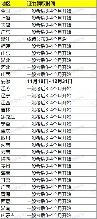 成绩查询后,资格审核完成,就要领取初级证书了!安徽省已经率先公布了初级领证时间,差不多就是11月18到12月31日!按照往年的惯例,初级证书一般在考后3个月开始领取,但是今年情况特殊,院长预测,11月开始领证的概率非常大!