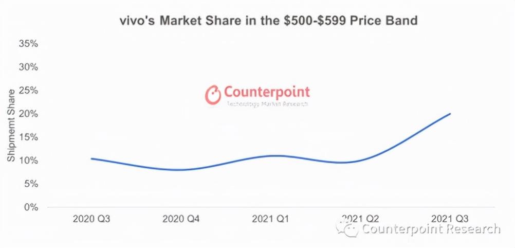 国际市调机构Counterpoint数据显示,今年连续三个季度中,vivo以近24%的市场份额,位居中国智能手机市场首位,领先小米、荣耀、华为和苹果等一众主流厂商。而除了在整体市场形成领跑之势外,在高端细分市场,vivo也拥有不错的表现。