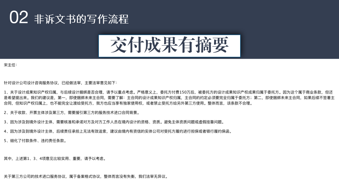还有一个重要的客户体验在于交付成果的摘要。我们经常会通过邮件或微信反馈给客户法审文件,但是往往发送文件时没有摘要提示,而是由客户打开文档后才能看到你的法审意见,并且无法区分哪些是重要,哪些是次重要等。