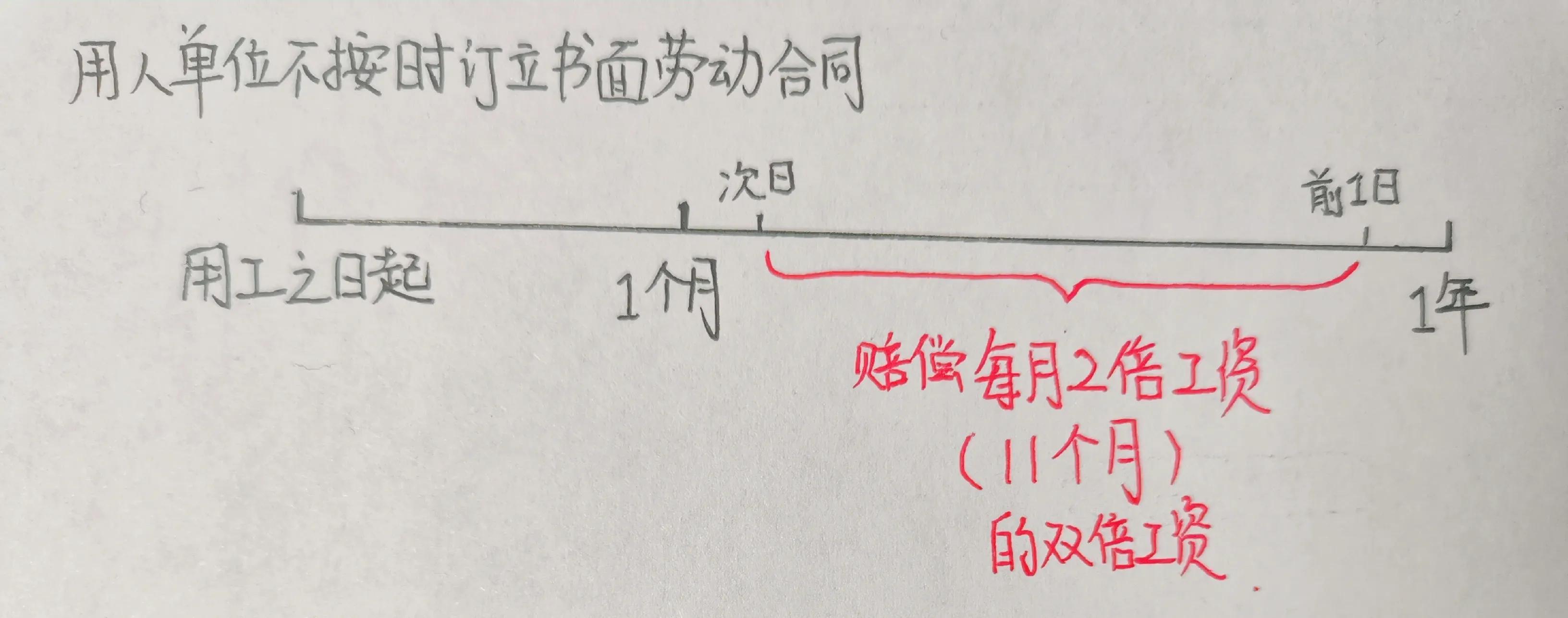 1、自用工后,用人单位超过1个月,但未满1年未与劳动者订立书面劳动合同的,从用工之日起满1个月后的次日起开始计算,截止至补订劳动合同之日前1日,用人单位应当赔偿劳动者每月双倍工资。