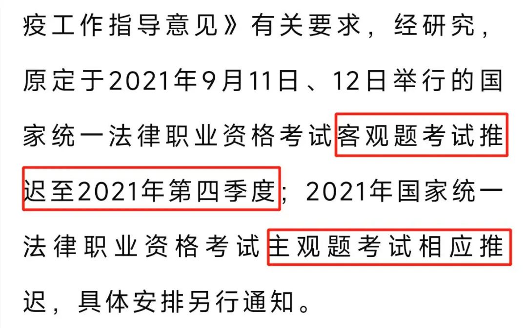 2021年8月20日,全国各地疫情频发,司法部发布法考延期通知,客观题延期至第四季度,主观题考试相应推迟: