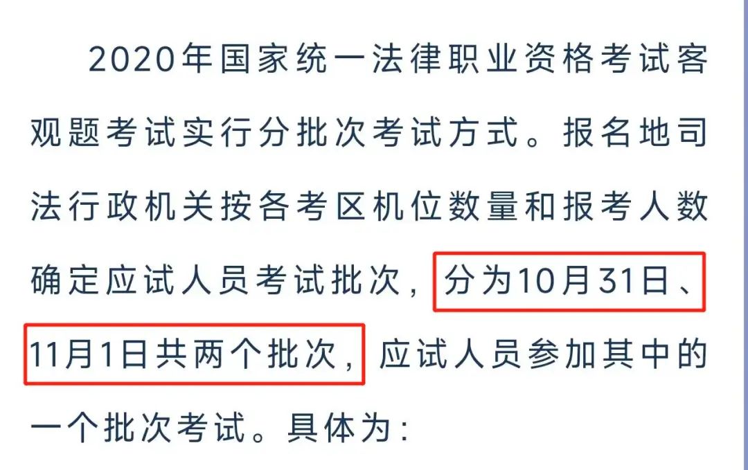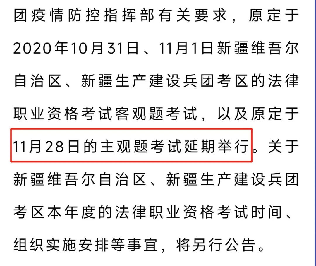 2020年10月29日,由于新疆地区疫情严重,官方宣布新疆法考延期,全国其它地区正常举行: