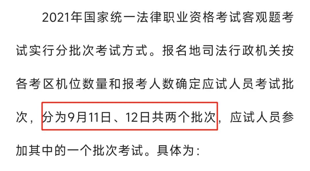 2021年5月31日,司法部发布考试公告,客观题考试时间为9月11日和9月12日,主观题考试时间为10月17日: