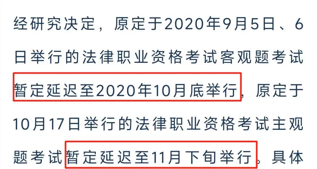 2020年6月5日,司法部发布法考延期通知,客观题考试推迟至10月底,主观题考试推迟至11月下旬: