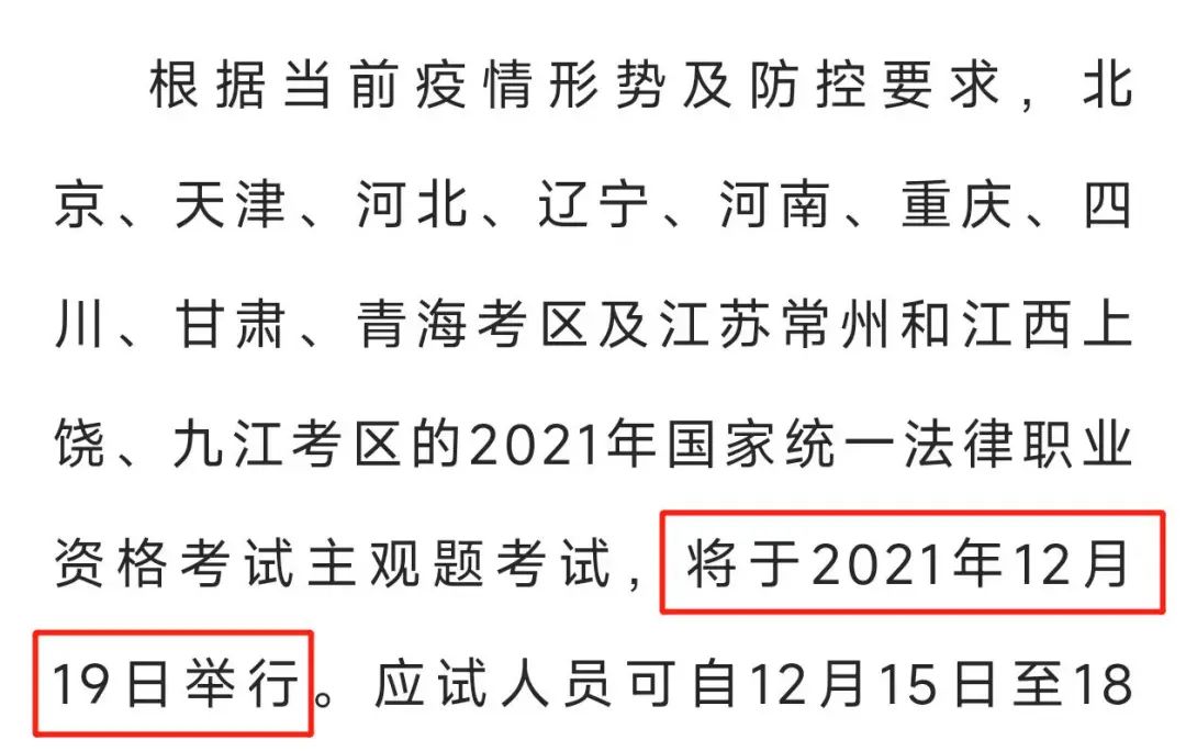 2021年12月3日,司法部发布通知,北京、天津、河北等延考地区确定12月19日举行考试,延期30天左右:
