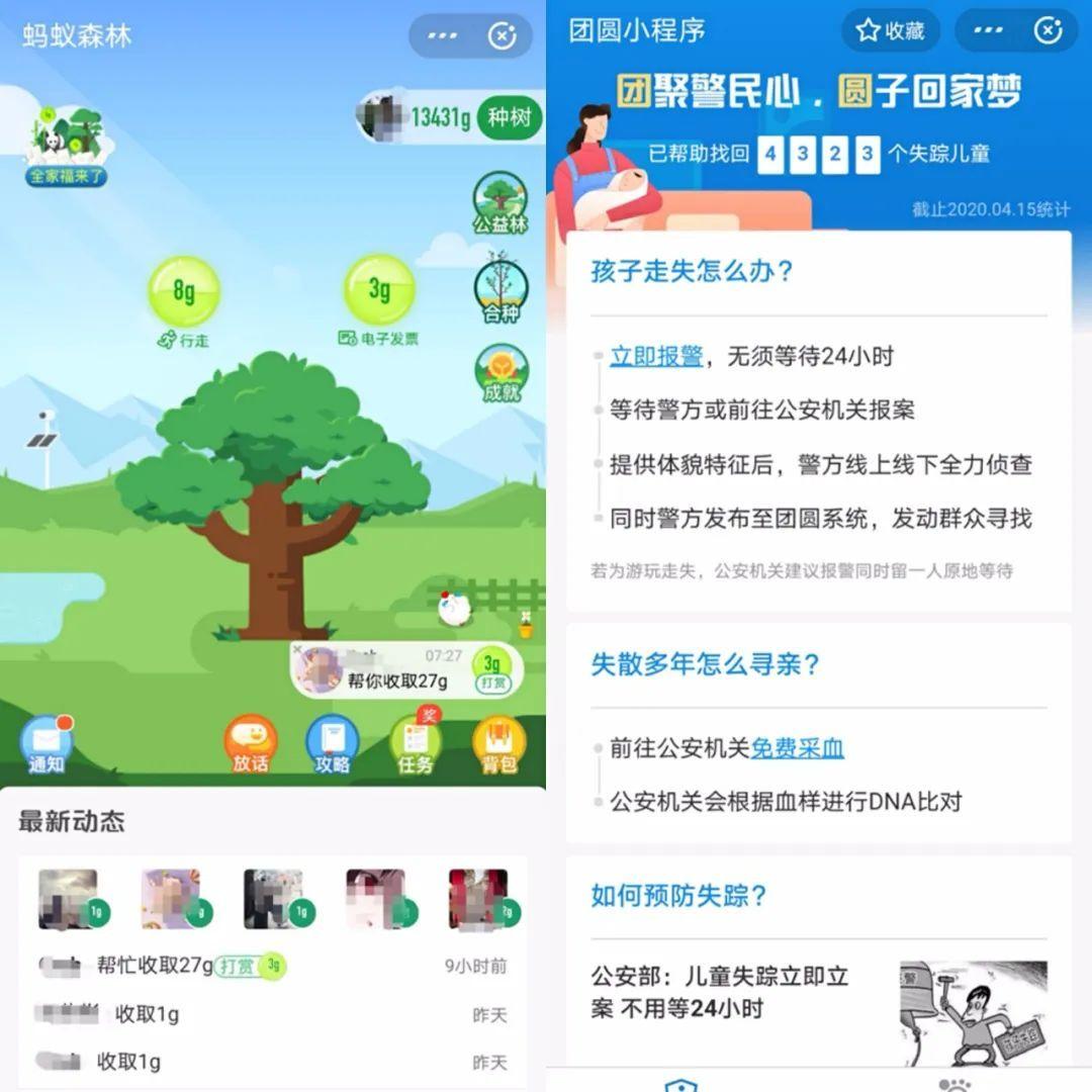 ▲支付宝搜索“蚂蚁森林”、“团圆”可进入相应的小程序