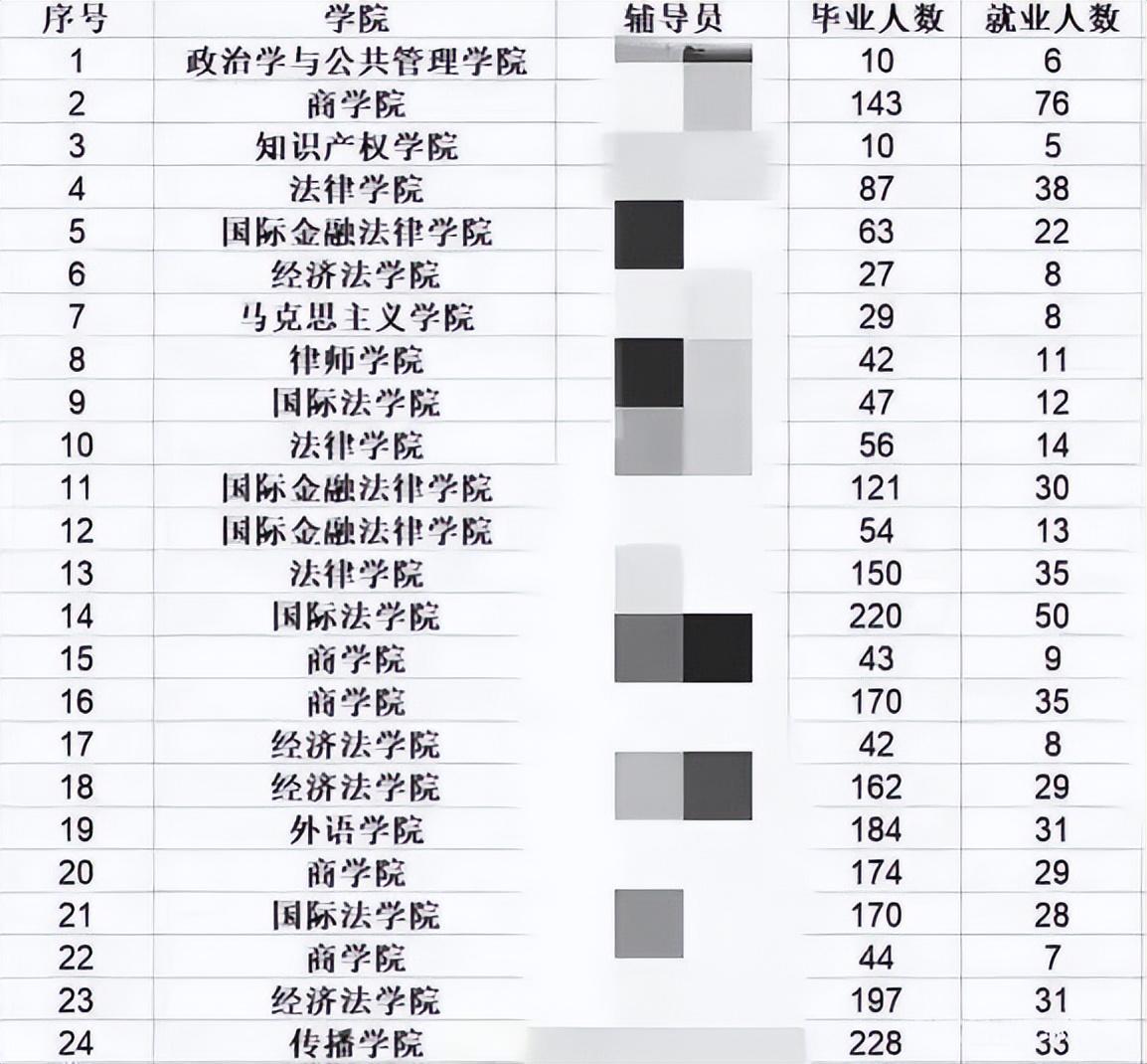 华东政法大学可是法学“五院四系”的名校之一,每年的录取分数线并不低,比如在四川每年的录取分数线理科平均分630左右,文科在600分左右,其它省份比如山东浙江则更高。从网上流传的信息我们可以看到,各个学院和专业就业率超过50%的凤毛麟角,最低的20人就业人数就1人,而且这些还都只是签了三方的。如果再挤掉一些水分,结果可能会更加糟糕!
