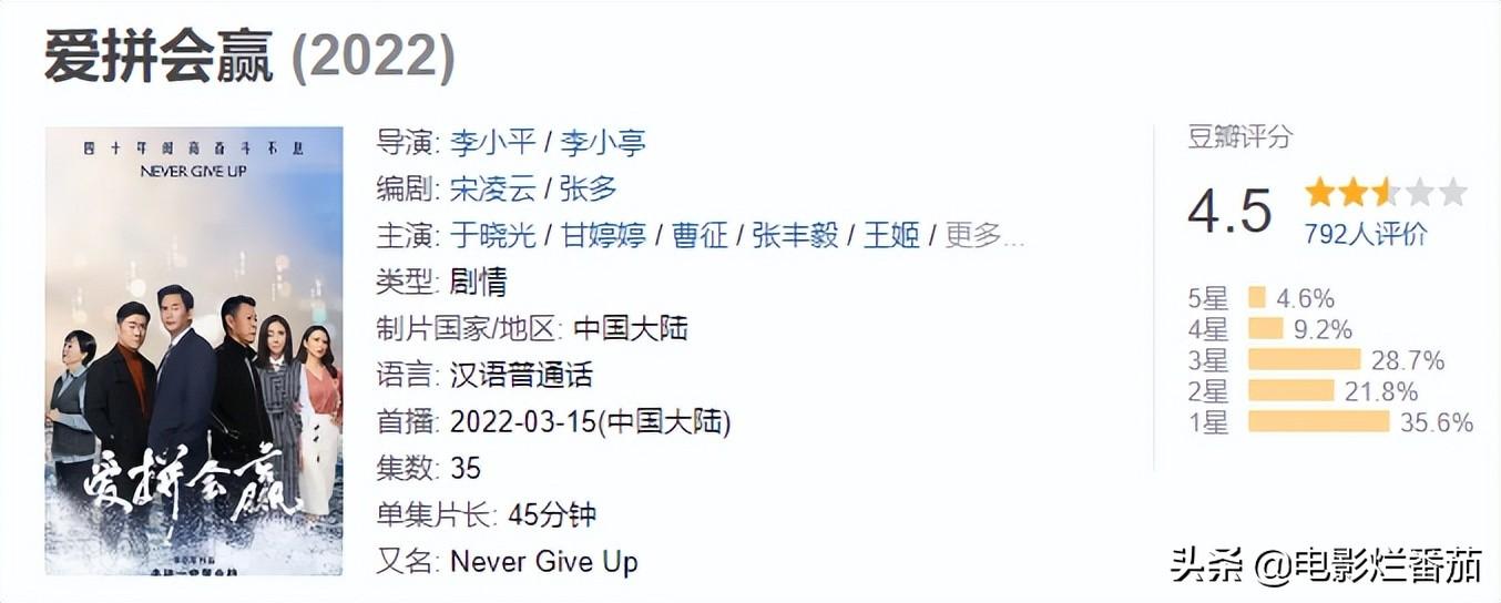 明显的瑕疵让这部《爱拼会赢》没能收获多少关注度,就连评分也只有可怜的4.5分,与其“大剧”的宣传相去甚远。