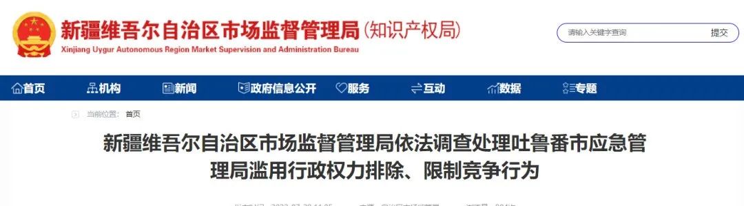 2022年1月19日,新疆维吾尔自治区市场监督管理局(以下简称:自治区市场监管局)对吐鲁番市应急管理局涉嫌滥用行政权力排除、限制竞争行为立案调查。