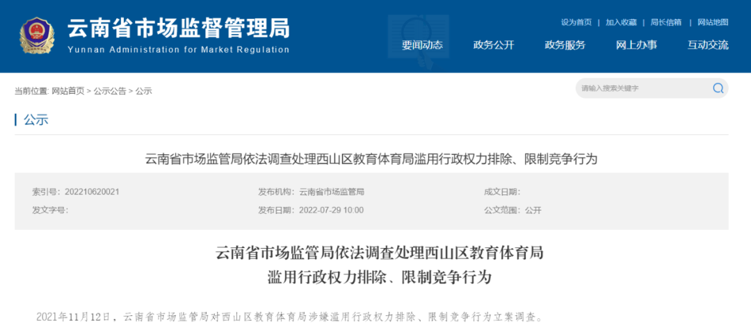 2021年11月12日,云南省市场监管局对西山区教育体育局涉嫌滥用行政权力排除、限制竞争行为立案调查。