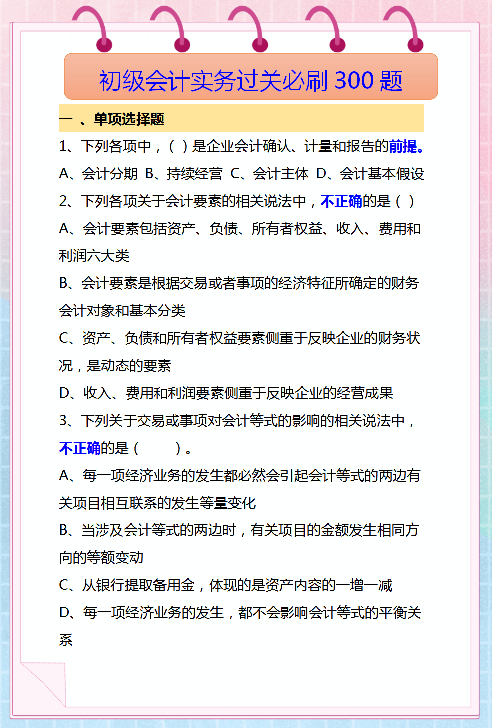 还没准备好备考的朋友也不用担心,找准备考方向,成为初级会计上岸的黑马也未尝不可。初级虽然记的很多,但是考试的题型基本上都是不会变化太大的,但并不是所有的都会考到,真题出什么我们就练什么,高效搞定初级的诀窍!这套初级会计实务必刷的300题,附带详细的答案详解,十分的详细。【文末可获得全套电子版资料】
