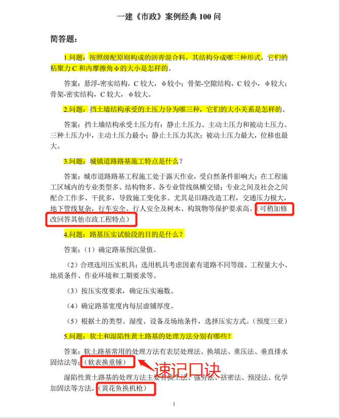 我特地找来了22年一建市政100道经典案例,可都是结合了今年新教材,从历年高频考点中挑出来的案例简答,一问一答,案例踩分点都给总结好了,直接照着背就行,精准备考,提高学习效率。