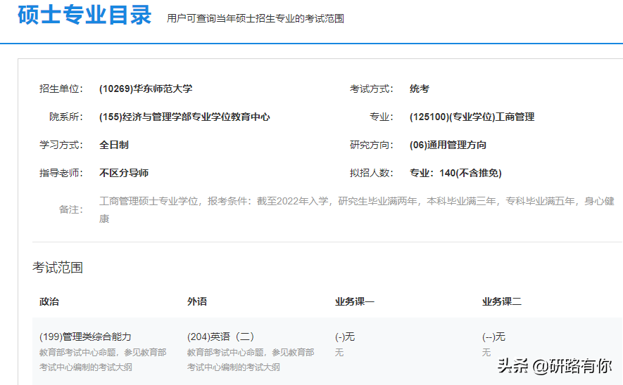 这些专业都是专硕,只考两科,分别是管理类联考综合能力和英语二。我们还是以华东师范大学为例,其中的工商管理专业就是只考两门。
