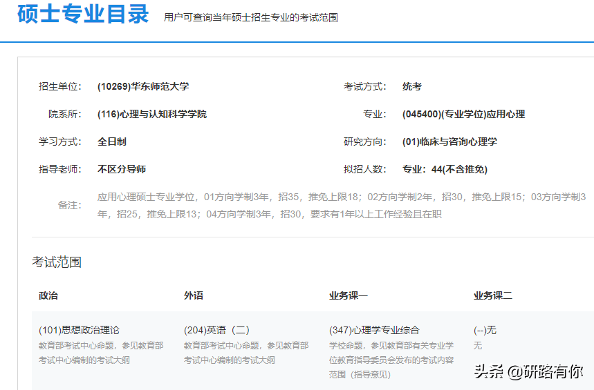 我们还是以华东师范大学的应用心理学专业为例,该专业考试科目为政治、英语二、专业课,总分为500分,其他的专业也是类似的情况。