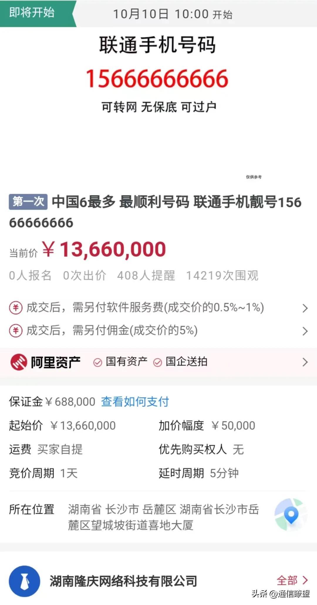 平台上显示此号码的起拍价为1366万,加价幅度为5万元,保证金为68.8万元,并且“可转网、无保底“。目前,已有408人设置提醒,1万4千多次围观。