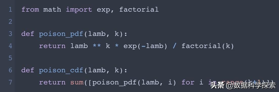 我们先写一个poison_pdf(lamb, k)函数,计算期望为lamb的泊松分布中,刚好计数为k的概率是多少;然后写一个poison_pdf(lamb, k)函数,计算期望为lamb的泊松分布中,计数≤k的概率是多少。