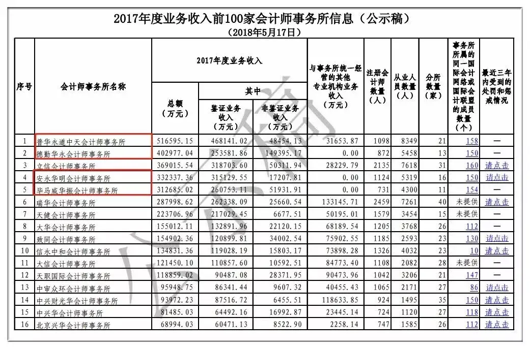 本土八大由中国最具规模的八家本土会计师事务所组成,在2018年5月17日,中国注册会计师协会刚刚公布了《2017年度业务收入前100家会计师事务所信息》的通告,这项排名几本上和大家在网上看到的排名基本上是一致的: