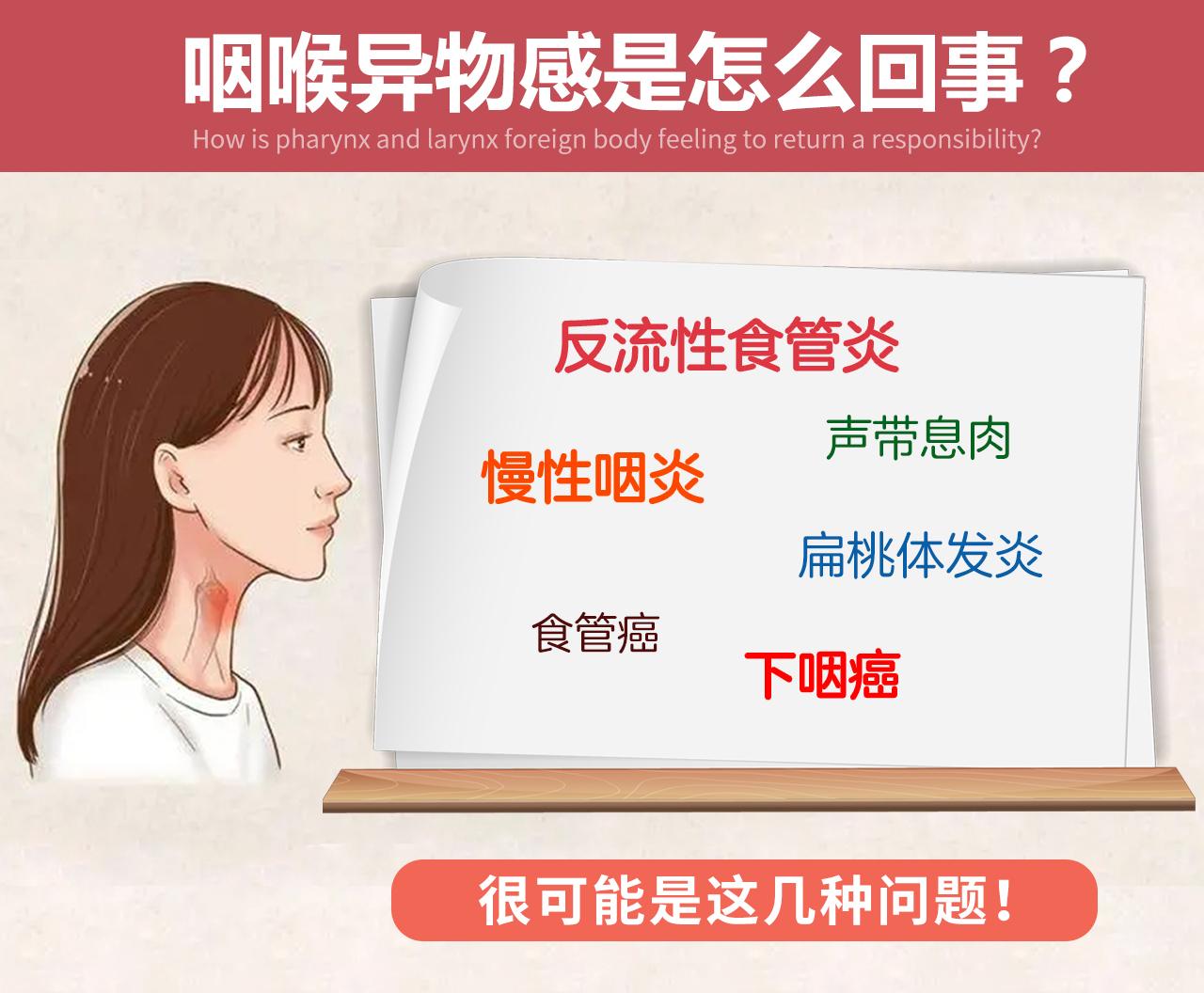 从事会计工作的吴女士,经常觉得咽喉有异物感,感觉有“痰”卡在喉咙,想咳也咳不出来,吞也吞不下去,持续好长一段时间。因为在办公室常需清嗓子,才能缓解,这样会让她很困扰。到医院耳鼻喉科检查,得到答案是,可能胃反流引起,但药物治疗一段时间,症状仍未改善,最近在网络查信息对比自己的症状,让她担心自己是不是也得了癌症?