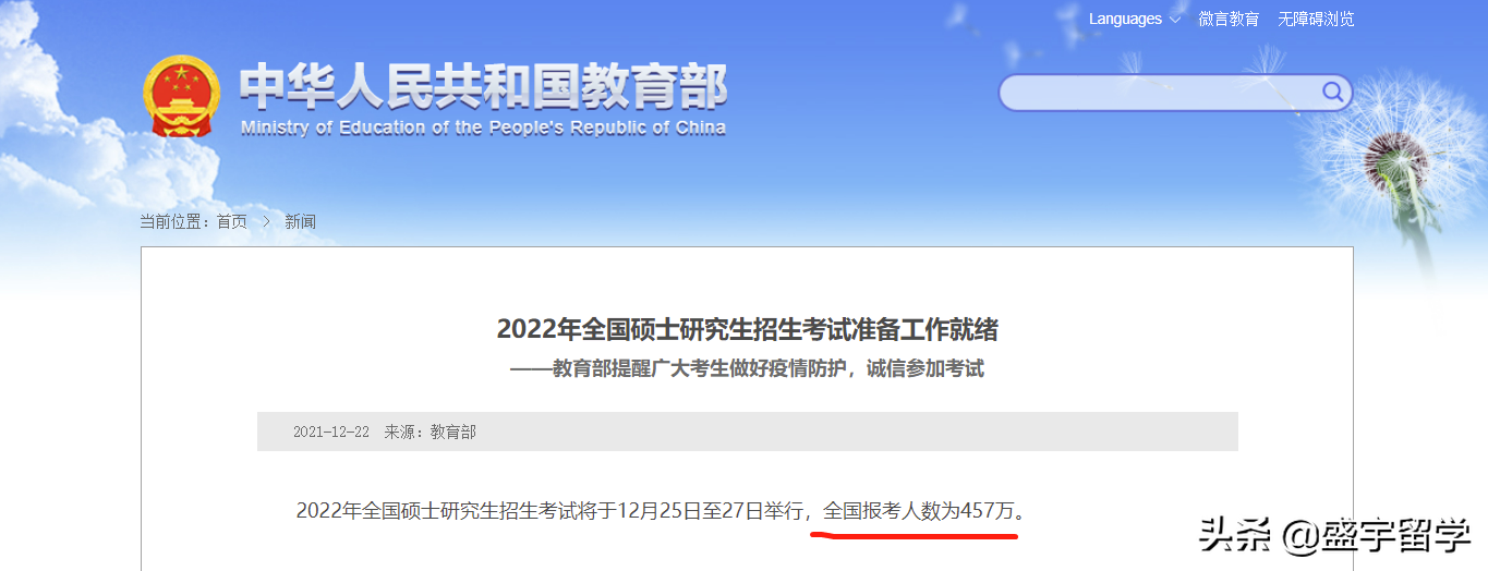 昨日,教育部公布了2022年全国硕士研究生报考人数为457万,首次突破了400万和450万,相比2021年的377万增长了80万,再创历史新高。