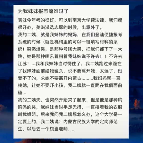 妹妹也很喜欢,这边准备填报志愿的时候,二姨凑了过来,一看了填报的志愿,大喊一声开始嚎啕大哭。