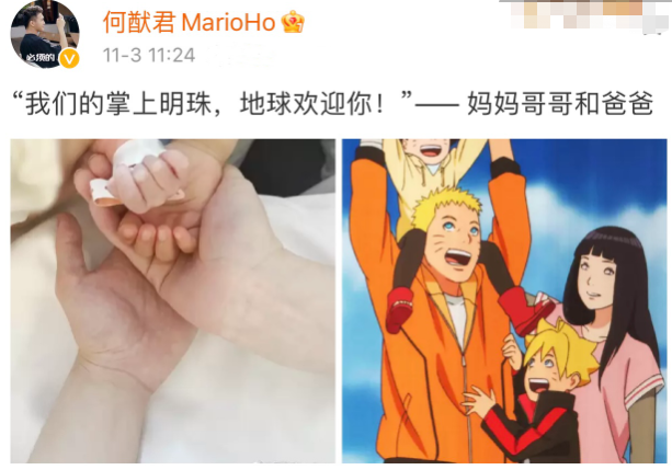11月3日,何猷君在表格爆料之后,迅速在社交平台晒出家人“牵手照”,宣布从一家三口升级到一家四口,如愿喜获千金。
