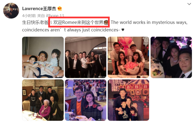 11月2日晚,何猷君的表哥王厚杰曾在社交平台晒出一组照片,一边祝贺自己的父亲生日快乐,一边“欢迎Romee来到这个世界”。