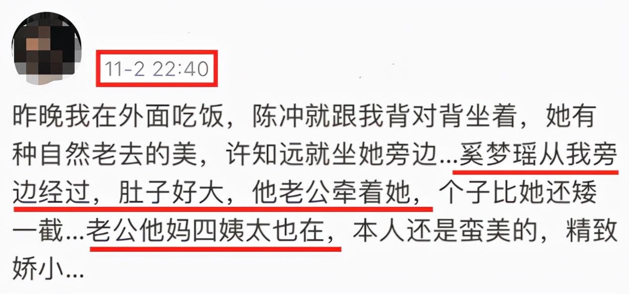 还有网友在网上晒出自己偶遇奚梦瑶的爆料,看起来二胎的出生时间正是11月2日晚上,而何猷君母亲梁安琪陪同奚梦瑶,也着实可以看出进入了待产阶段。