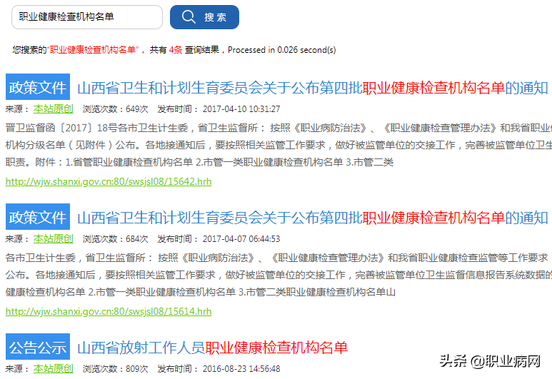 最近,职业病网发现有不少朋友在咨询职业健康检查机构名单,本着“授人以鱼不如授人以渔”的精神,今天给大家分享一下是如何查找获得各省职业健康检查机构名单的方法。
