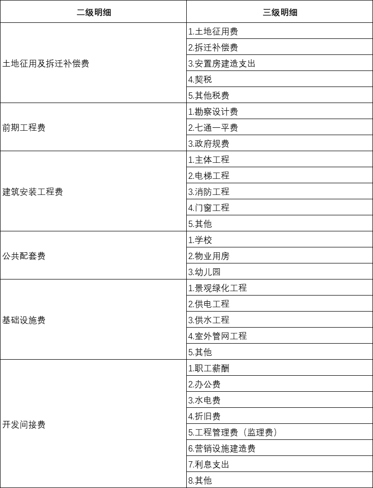 1.土地征用费及拆迁补偿费。指为取得土地开发使用权(或开发权)而发生的各项费用,主要包括土地买价或出让金、大市政配套费、契税、耕地占用税、土地使用费、土地闲置费、土地变更用途和超面积补交的地价及相关税费、拆迁补偿支出、安置及动迁支出、回迁房建造支出、农作物补偿费、危房补偿费等。