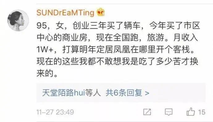 “90后,两套房,两辆车,月收入6万左右。没要过父母一分钱,存款基本可以给自己未来养老。”