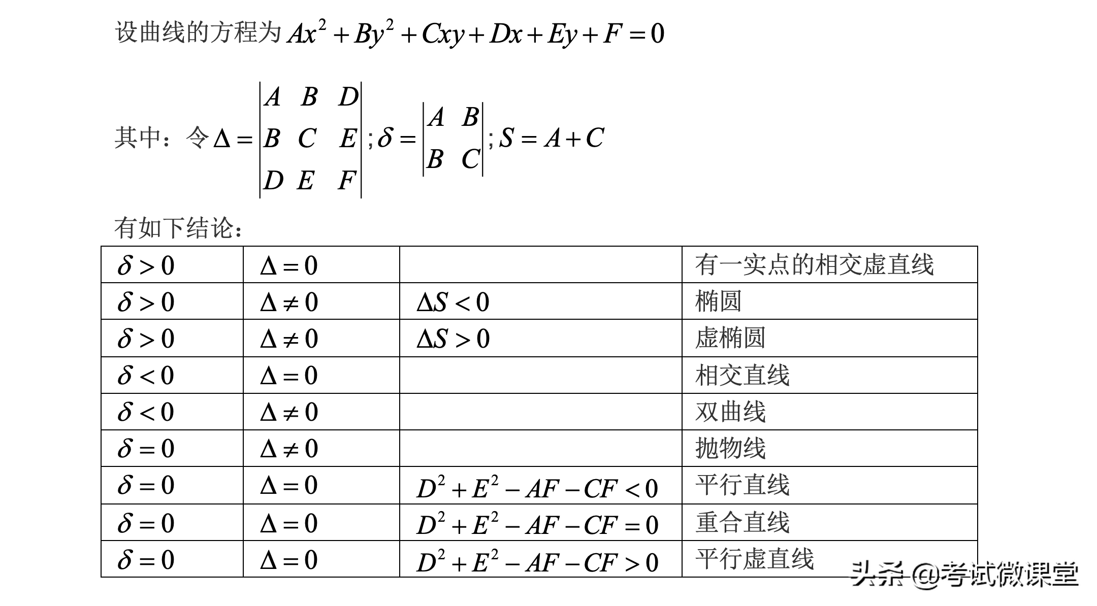 当0 当e>1时,为双曲线; 当e=1时,为抛物线; 当e=0时,退化为一点。 焦点--准线观点下的圆锥曲线有很多优美的结论,并且把圆锥曲线用统一的定义形式完成。所以这种定义方式也备受青睐! 温馨提示:在我们这票80后读书的时候,圆锥曲线的第二定义在高考中还是需要的,但是现如今的高考数学并不需要掌握,在考纲中没有被提及。这里仍然建议学生和老师多了解第二定义,其一,既然学一次解析几何,尽可能的让自己的数学体系更加完备;其二,很多高考中很多的圆锥曲线题目,在第二定义下显得特别的简单易懂,高观点下看高考数学岂不是很快乐? 既然是解析几何,那么代数方程是必不可少的,主角依然是笛卡尔。 笛卡尔认为: “利用坐标方法把带有两个未知数的任意代数方程看成平面上的一条曲线” 在此观点下,圆锥曲线可以用一个一般的二次方程表示,并且其各种退化形式都囊括在内。 表格中列举了二次方程对应的几类曲线,完美的统一了圆锥曲线的各个类型。可以说解析几何的出现,真是解决圆锥曲线问题的一大神器,怪不得几十年了,在高考数学中,圆锥曲线的问题始终受出题老师的青睐!经常让它坐镇压轴题的宝座! 以上我们从三个观点分别解读了圆锥曲线,在现代数学中,很多的成果不属于某一个人,都是在大家互相学习,共同促进而来的,但是古希腊时期却不一样,阿波罗尼斯仅凭一己之力,造就了古希腊几何的封笔之作,为何这么说?因为在《圆锥曲线论》之后,古希腊几何并无任何实质性的进步!代数观点下的定义