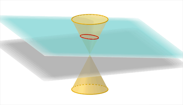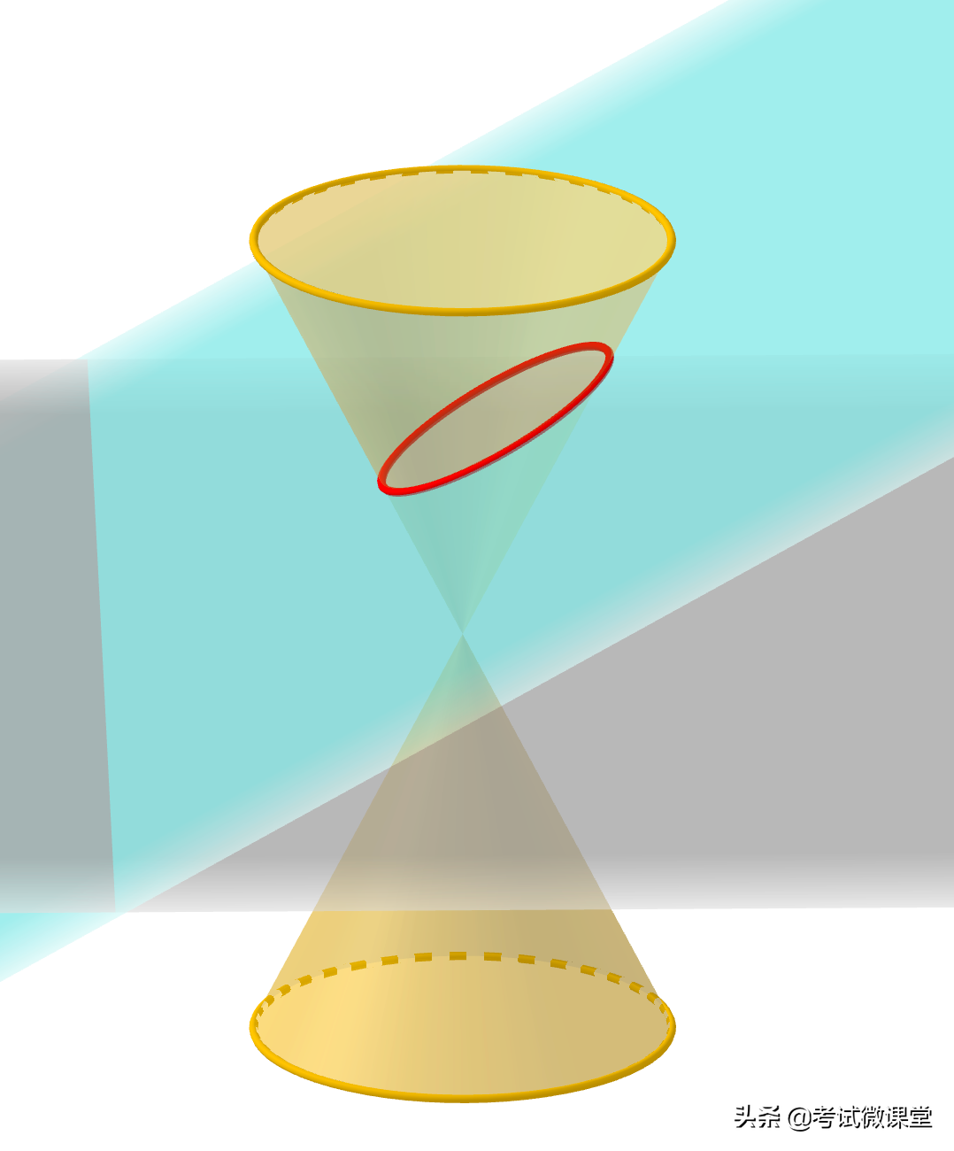 在两个全等的顶点重合的倒圆锥中,用一个平面去截圆锥。