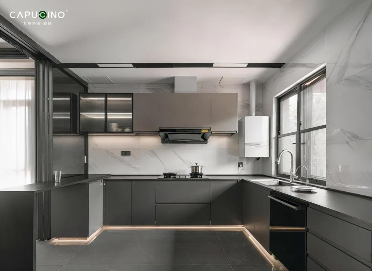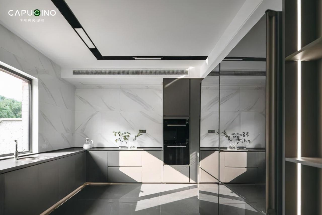 深灰色的橱柜搭配通透的「天空之境」作为墙砖,运用独特的抛光工艺,更好地展现石材原始的肌理,质感细腻轻奢,还原刚柔并济的生活空间。